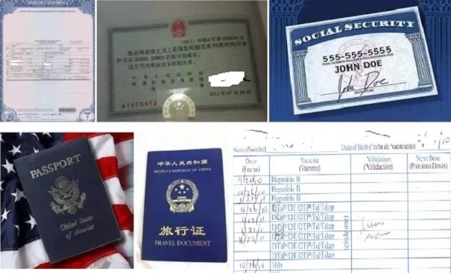 -- 常规是办理五证:出生证、出生证三级认证、社安卡、美国、中国旅行证。